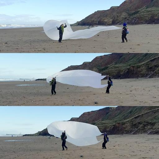 This seminar focuses on the first Side Quest, a walk that took place between Whitby and Sandsend that was part sensory exploration, part experimental performance, part creative chaos. Bryony Aitchison led a poetry workshop using onomatopoeic words in response to the sounds of the beach. Collaborator and multimedia artist Marilou Chagnaud’s wind objects—large sails-like objects held by participants to ‘map’ the wind—invited physical interaction with the environment’s unseen forces. Gaia Blandina's sound workshop used found beach objects, harmonicas, and the crashing waves to turn the landscape into focused solitary or collective activities, or into an impromptu jam. In the longest stretch of the walk, a long silent period allowed participants to simply be, with no instructions but to navigate and explore the sand, the subtle changes of weather, air direction, tides, and whatever might arise in that space of quiet and unpredictability.