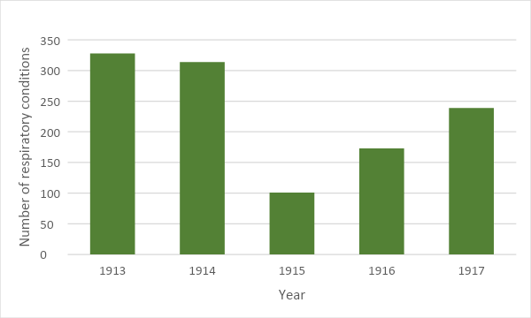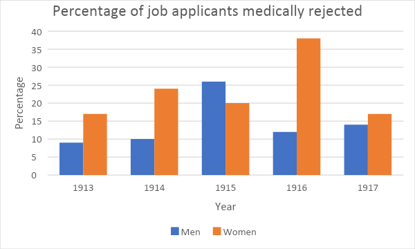 Impairments and differences can take many forms, and examples of evidence for them within the our archives are to be found throughout this guide. Beyond individual cases, data may be obtained which provides a more quantitative overview of health. For example, the Medical Department Reports, 1914-1953 (R/DL/LH/1), in the Rowntree & Co. archive reveal the changing physical health presentations of men and women in the company’s workforce, as statistically summarised by their medical group. The graphs below provide some sample statistics from which numerous interpretations arise, including that a higher proportion of women than men were rejected from employment on health grounds, and that the impact of the First World War can be seen from 1915 onwards, where the gender balance in consultations changes radically and, for a reason without an immediate explanation, the number of respiratory conditions decreases considerably.