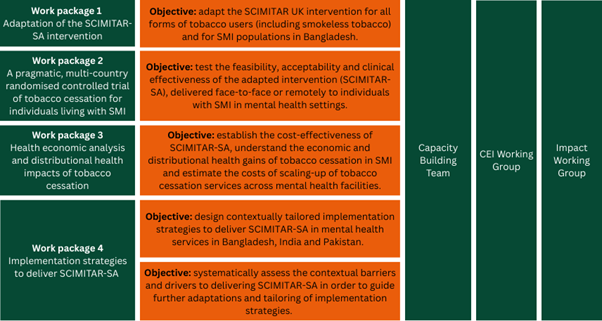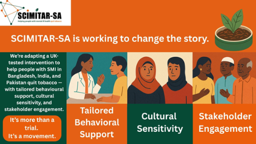 The NIHR-funded SCIMITAR-SA project investigates methods of treating tobacco dependence among individuals in South Asia with the most severe forms of mental illness. It will run for four years: 2024-2028.