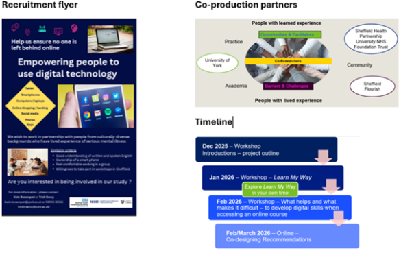 People with SMI are more likely than the general population to be subjected to the ‘digital divide,’ defined as lack of access to digital technology or the skills or motivation to use it (Spanakis et al. 2021). Despite evidence from our previous work (Dragon, 2023) which showed that providing tailored support to people with SMI, to use freely available online digital skills courses (https://www.goodthingsfoundation.org/learn/learn-my-way), enabled them to develop foundational skills, the courses were not culturally diverse. The SERPENT project addresses this gap through co-production with people from a range of ethnic minority groups. By collaborating with community organisations such as Sheffield Flourish, the team aims to build long-term trust and ensure meaningful involvement of underserved ethnic minority communities, who are disproportionately affected by digital exclusion.
