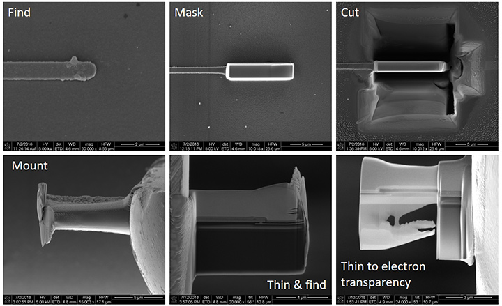 Step-by-step procedure for TEM lamella preparation. The identification and extraction of magnetic devices for examination in the TEM (see JEOL 2010 for bright-field image). Extraction and milling is about 5 to 6 hours per sample.