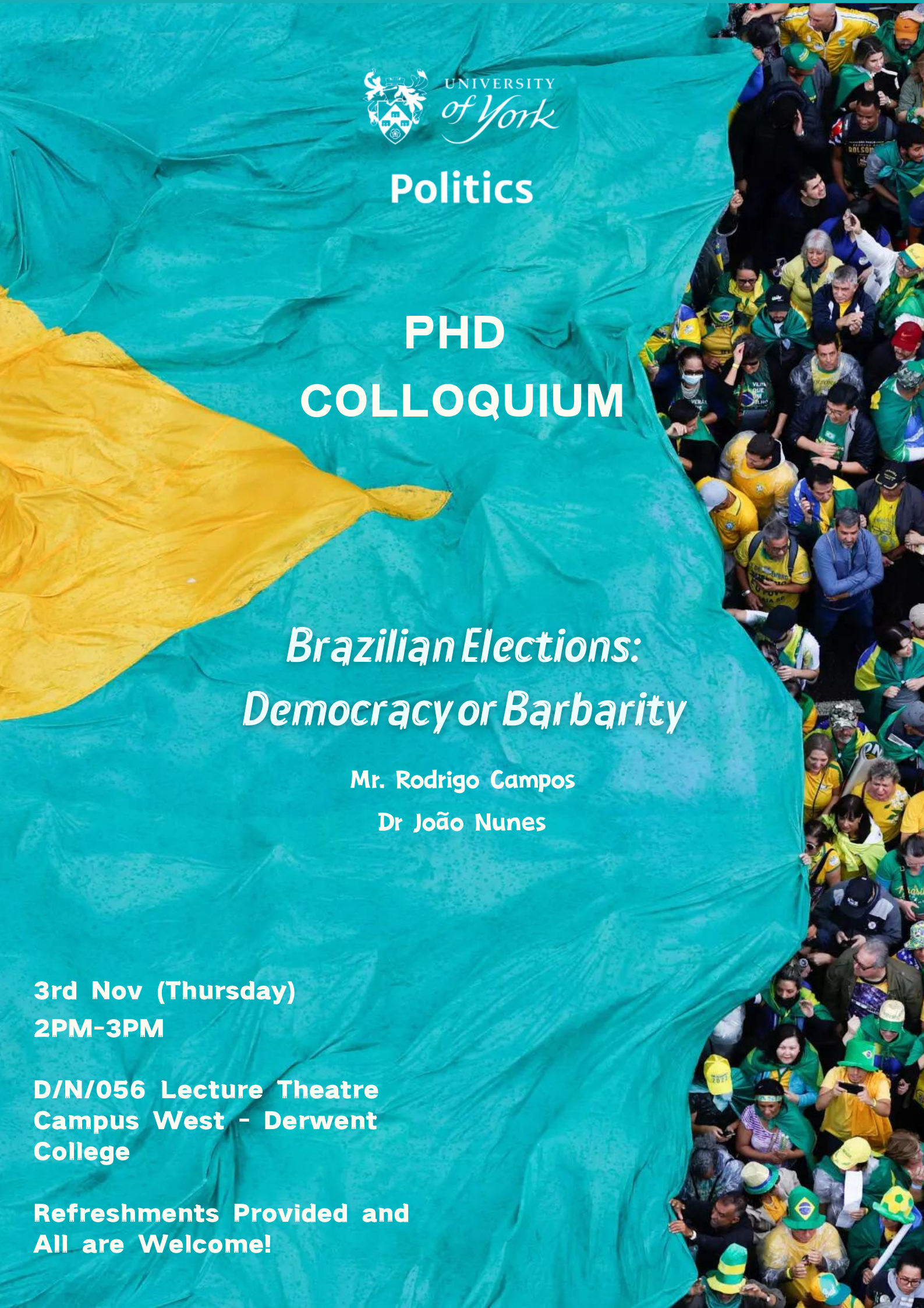 Next Thursday join Dr Joao Nunes and Rodrigo Campos when they will be discussing the Brazilian Elections in the week six PhD Colloquium.