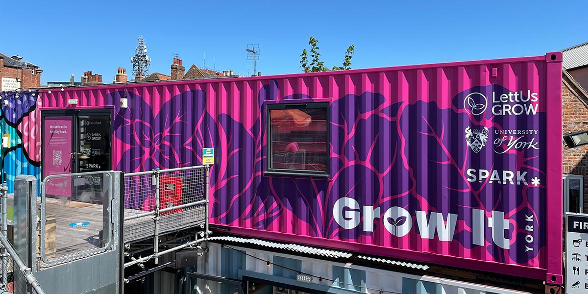 Vertical farms are popping up around the world and York is no exception. The University’s FixourFood research programme recently launched Grow It York, a vertical farm located within a shipping container in Spark:York, a Community Interest Company (CIC) in the centre of York. Grow It York uses technology from a Bristol-based SME LettUs Grow to grow crops without soil, in stacked beds under controlled lighting using aeroponics - spraying the plant roots with a fine mist. We are using Grow It York to explore how to integrate vertical farming into urban communities for social and environmental benefits.